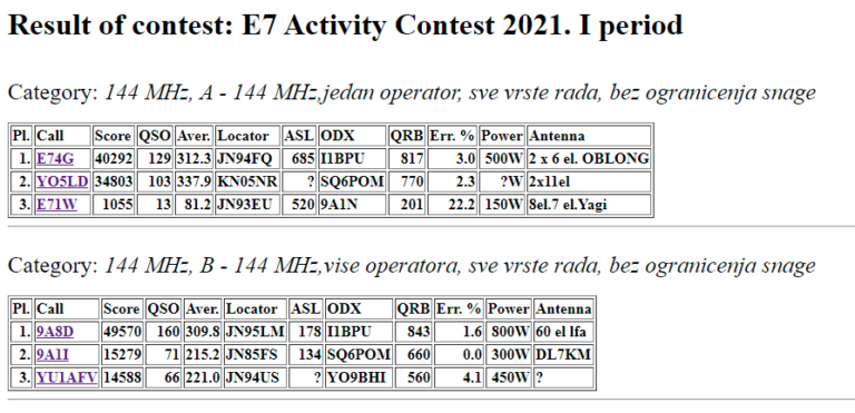 Cijenjeni takmičari, Objavljujemo rezultate E7 CW VHF Contest-a 2020. Isti, ukoliko ne bude žalbi, postaju zvanični 8 dana...